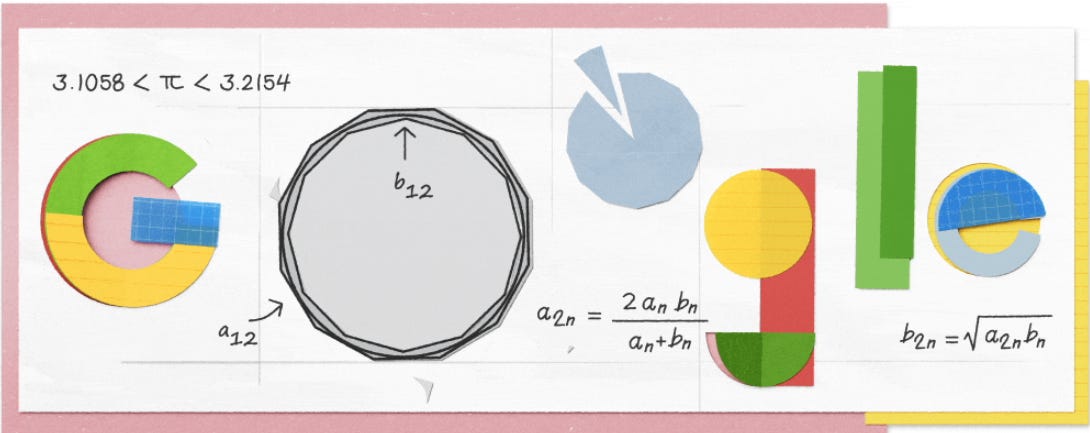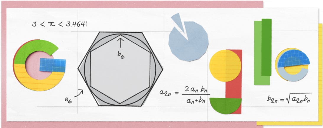 Archimedes started out using hexagons as the bounding polygons, likely because they could be broken down into equilateral triangles making the calculation of the perimeter easier. But hexagons don’t look very much like circles (see the first still from the Google Doodle below). This initial attempt would have bounded π between 3 and approximately 3.4641. Not very good, given the Egyptians and Babylonians had both done much better centuries earlier.